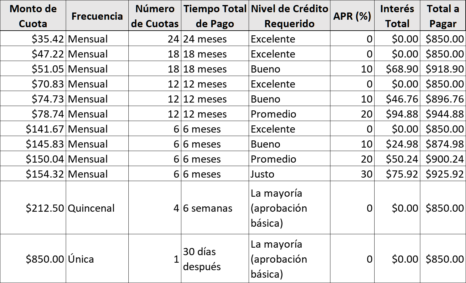 Para “Paga con el tiempo”, términos de 6-24 meses con APR variable (0%-35.99%). Mejores créditos califican para 0% APR y términos largos (bajas cuotas); créditos inferiores para APR altos y términos cortos (altas cuotas).